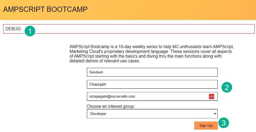 The beauty of Sandesh’s Debug code is in its simplicity. By only adding a few lines of mixed HTML and Ampscript the user can quickly and easily validate key data points as they are developing their cloud pages.
