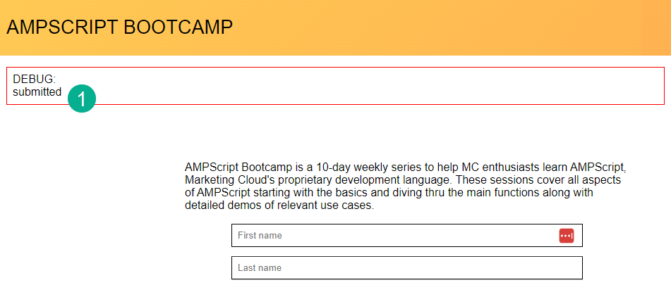 (1) Once the call to action button is clicked the form resets and the Debug variable is now set to “submitted” proving that a submission went through.