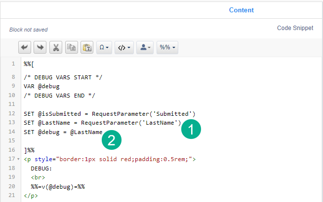 (1) Open up a P or paragraph tag outside of the ampscript block to create an outline of the Debug section in the cloud page. He closes his P tag on line 20.