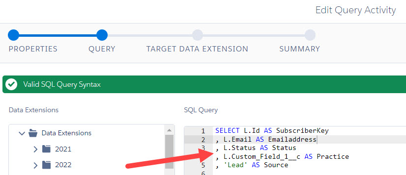 One of the most common errors when building SQL queries in Marketing Cloud has to do with missing commas in the SELECT statement. Here’s an example of this error: