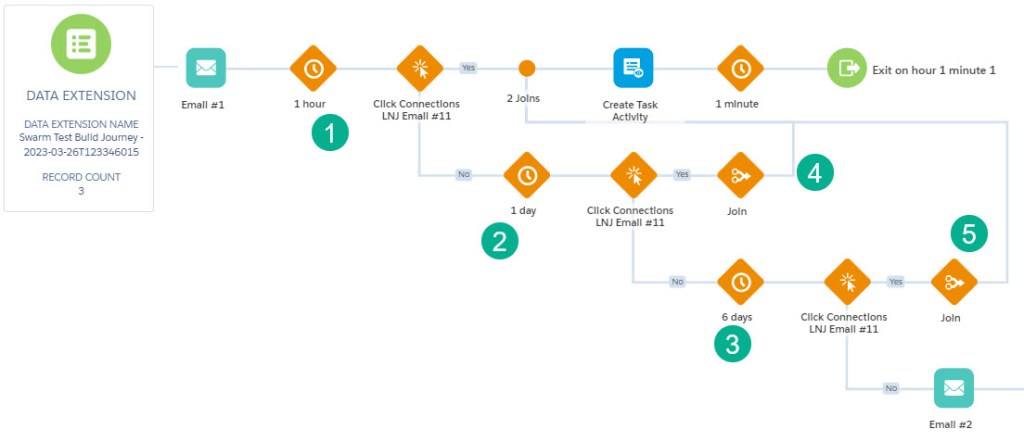 To move in those engagers immediately we had a three tiered (sometimes up to 5 tiers) Engagement Split tree (steps 1-3) where we moved on subscribers if they engaged in that all important first hour, the first day and caught any stragglers who engaged beyond that. We also had to build in several Join Activities to pull those engagers into the same path.