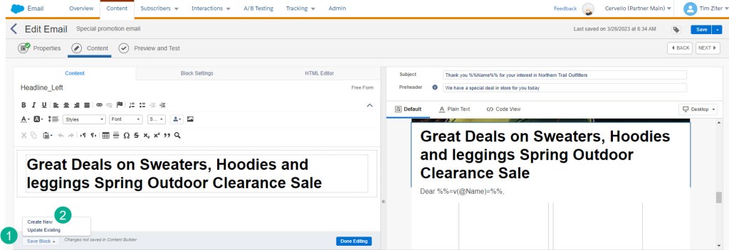 When working in a content piece in whether it is a cloud page or an email you can select the (1) “Save Block” button in the lower left corner and (2) “Create New”.