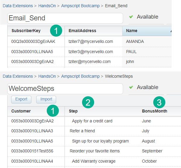 Here are the two data extensions that Malik will be referencing to power this solution.