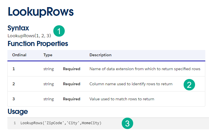 (2) The first field is the name of the data extension that the data is being pulled. The second is the column that is used to identify the record(s) needed and the last field is the value that will be used to match the column.