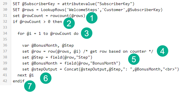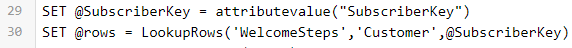 First he sets a variable @SubscriberKey to be used for the third value. And based on the screen capture above ‘WelcomeSteps’ is the name of the data extension and ‘Customer’ is the field that matches the @SubscriberKey variable or the name of the customer key.