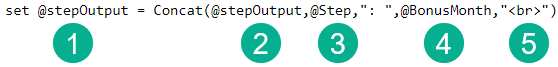 (3) In our output line we want to dispaly the Step or @Step variable first. In a Concat any variable does not need any quotes around it. To add formatting the next variable is a colon and a space “: ” you can add any formatting just make sure to have it surrounded by quotes.