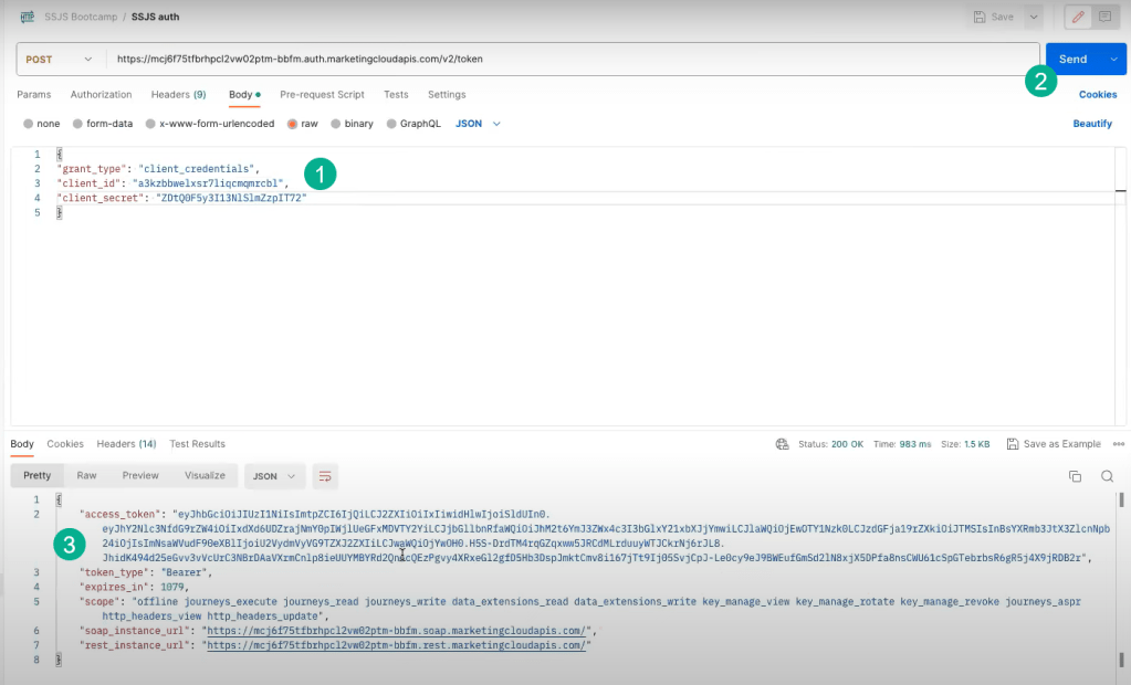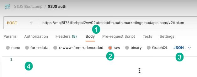 Validating in Postman will do two things (1) it will help the team familiarize the basics of an API call to give perspective on what we’ll be coding in SSJS and (2) validate the connect as Postman will give the team more details on errors connecting than what the user will see on a cloud page.