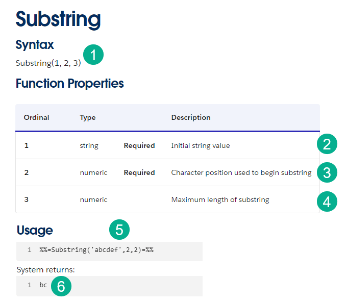 (5) An excellent example provided by Salesforce. Here our variable is ‘abcdef’, it will display starting on line 2 or ‘b’ and the length of what will be displayed is two.
