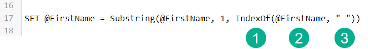 IndexOf is a handy function that can be used in many applications. For our use case we need to determine the position in our first name variable where the space occurs as that will indicate the end of the first name.