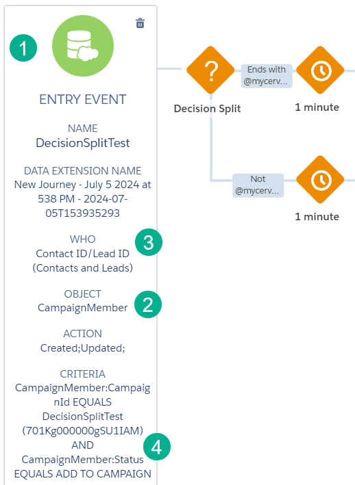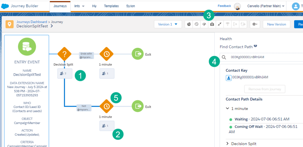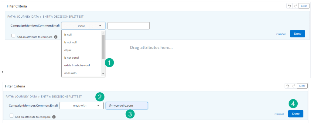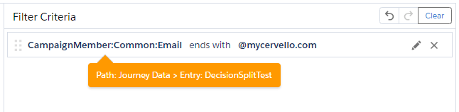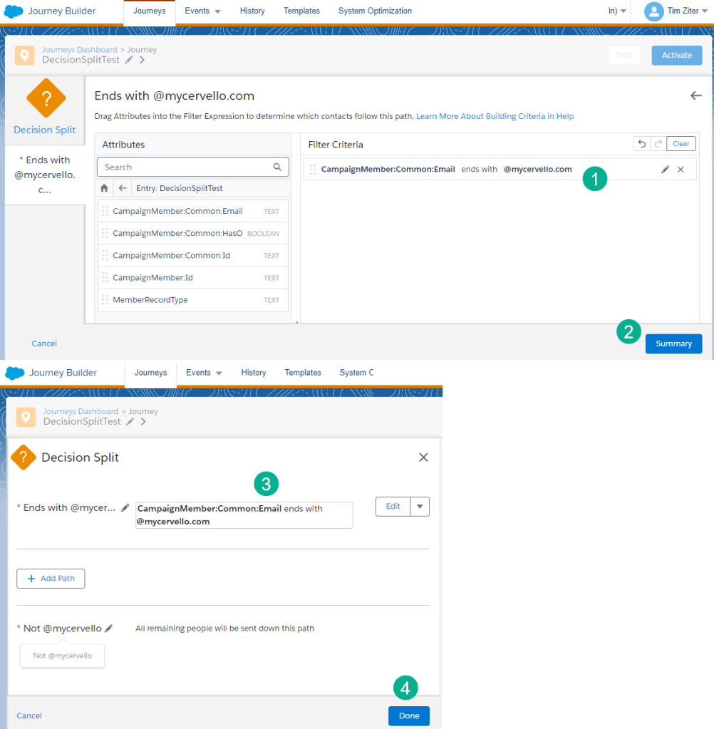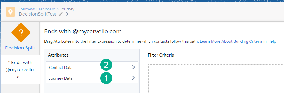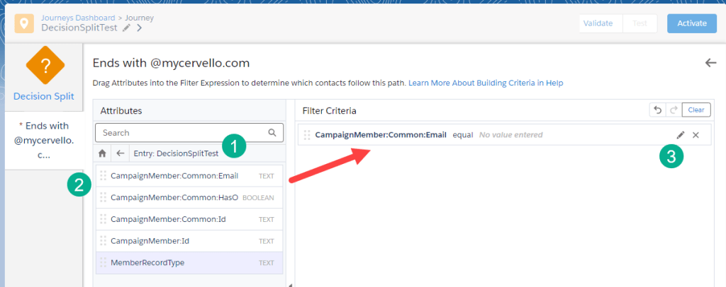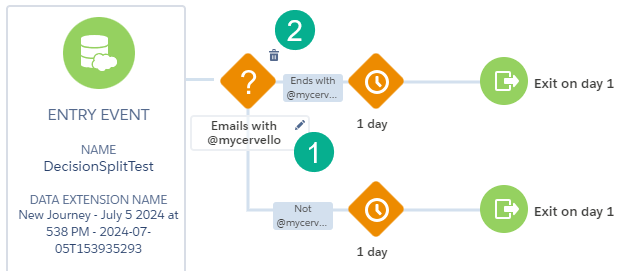 (1) In the top path, clicking on the pencil icon allows us to edit the path name to “Ends with @mycervello.com”. So that we can safely test our journey we are only going to allow records to enter the main path if their email address ends with @mycervello.com.