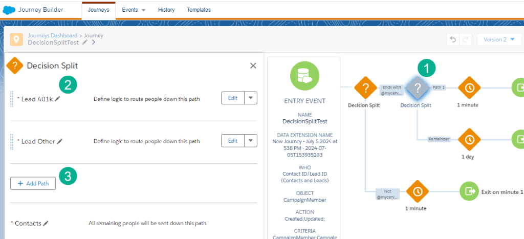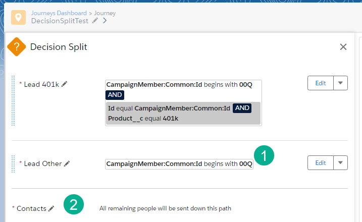 (1) Edit and name the Decision Split by clicking on the pencil. In a complicated Journey this will help you understand the functionality at a glance.
