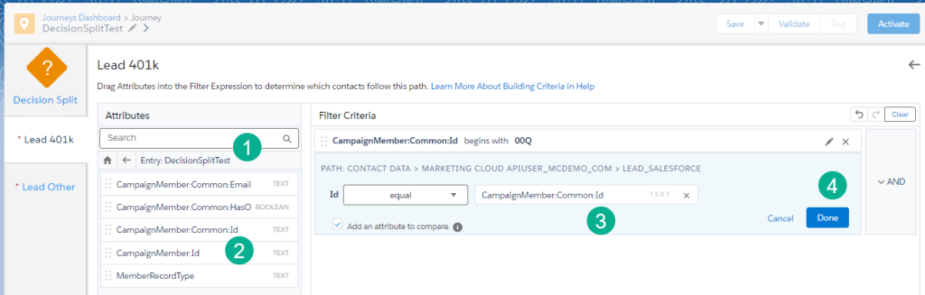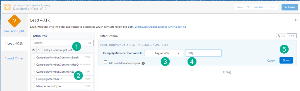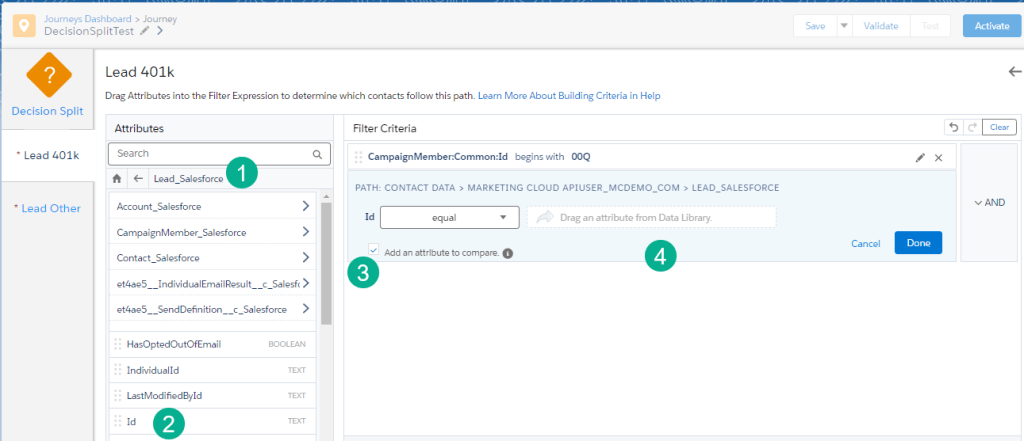Clicking edit into the Lead path first we want to send only leads down this path. We know from our data set that Lead records from Sales Cloud always start with a 00Q vs a Contact starts with 003. So first we’ll select the Journey Data field that has that ID.