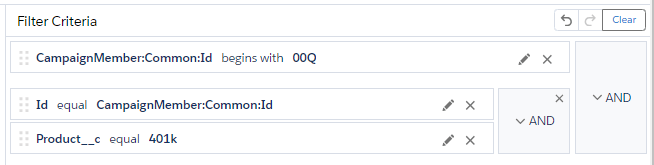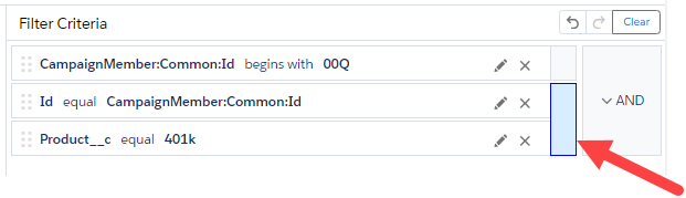 If you need to have certain fields be grouped into a nested AND or OR pairing stack them on top of each other in the Filter Criteria and hover over both fields.