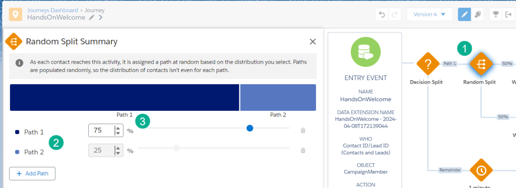 (1) Adding the Random Split to the journey canvas is as easy as dragging it from the menu on the left and dropping it on the canvas.