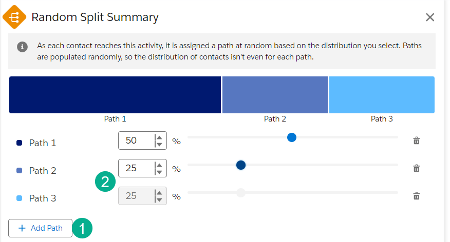 (3) You can easily modify the percentages up or down for each path. So in this example if you feel that Email path A is stronger you can select 75% of subscribers to go down the preferred path.