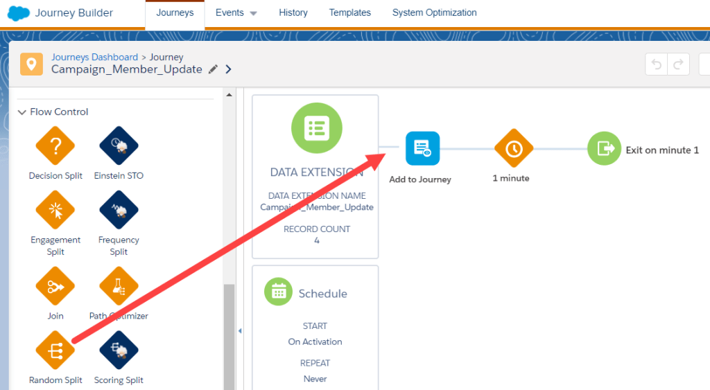 First we’ll add the Random Split activity to our Journey canvas.