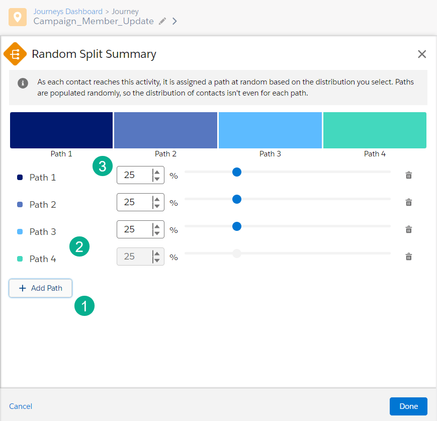 (2) In Path one subscribers will not only receive email A but will also have additional custom activities included as part of the test, in this case an update to the Campaign member status in Sales Cloud to Email A Sent.