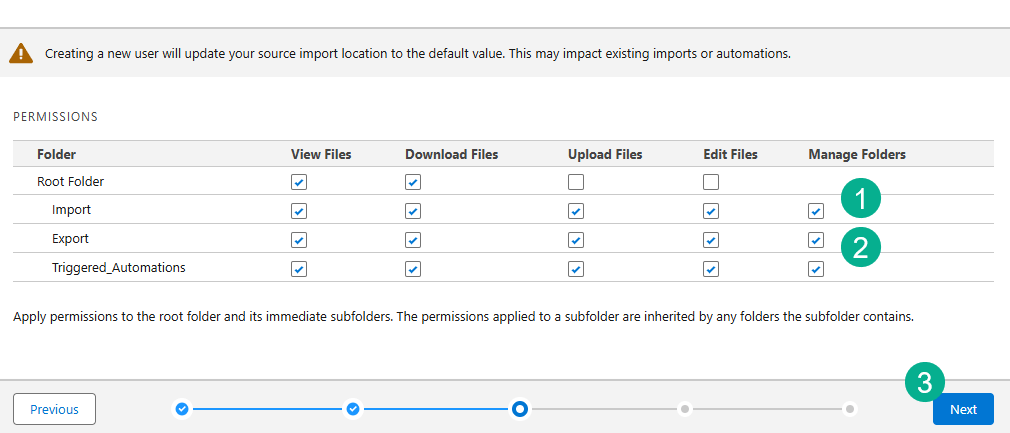 (1) and (2) Select the permissions on the key folders (Import and Export).