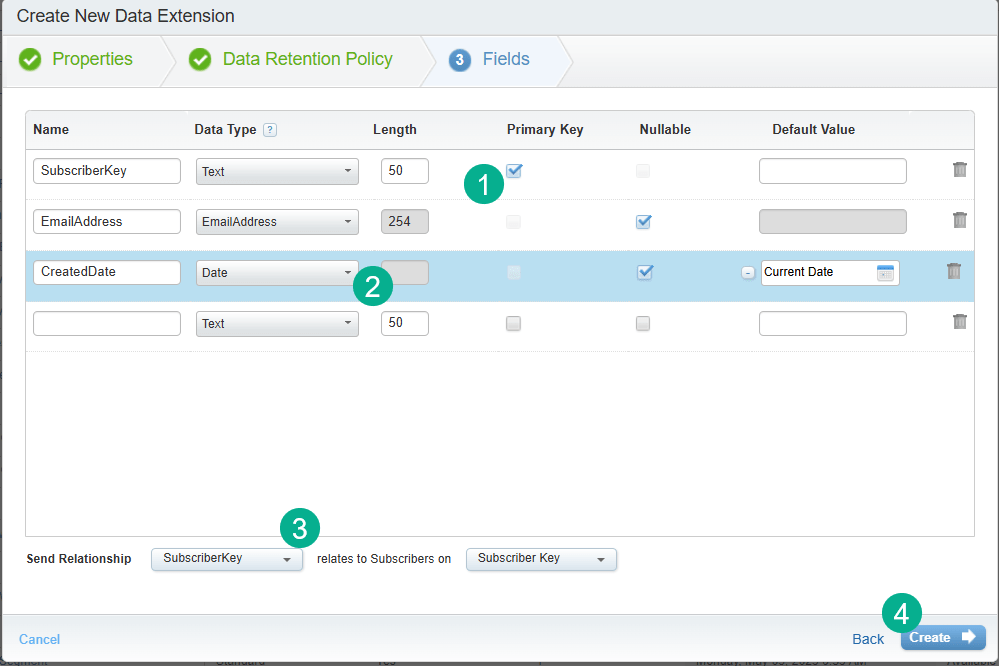 (1) Enter in a name ideally without any spaces because it makes it easier to write queries when your data extension doesn’t contain spaces.