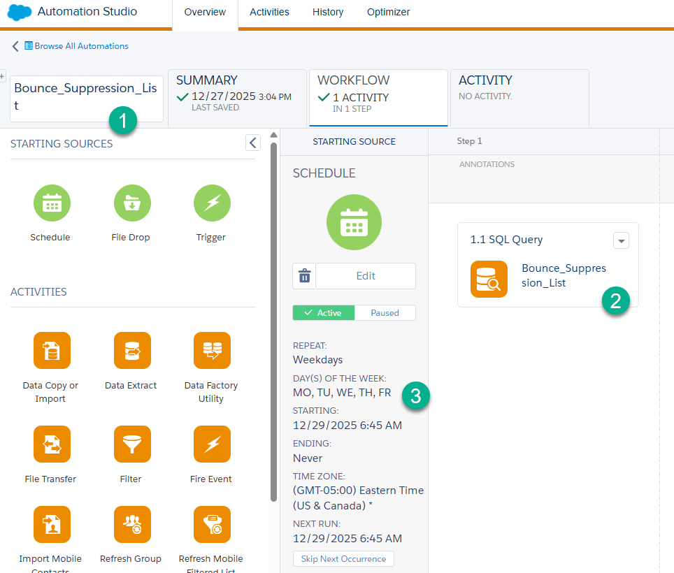 4.) How to create an automation to update a Bounce suppression list data extension