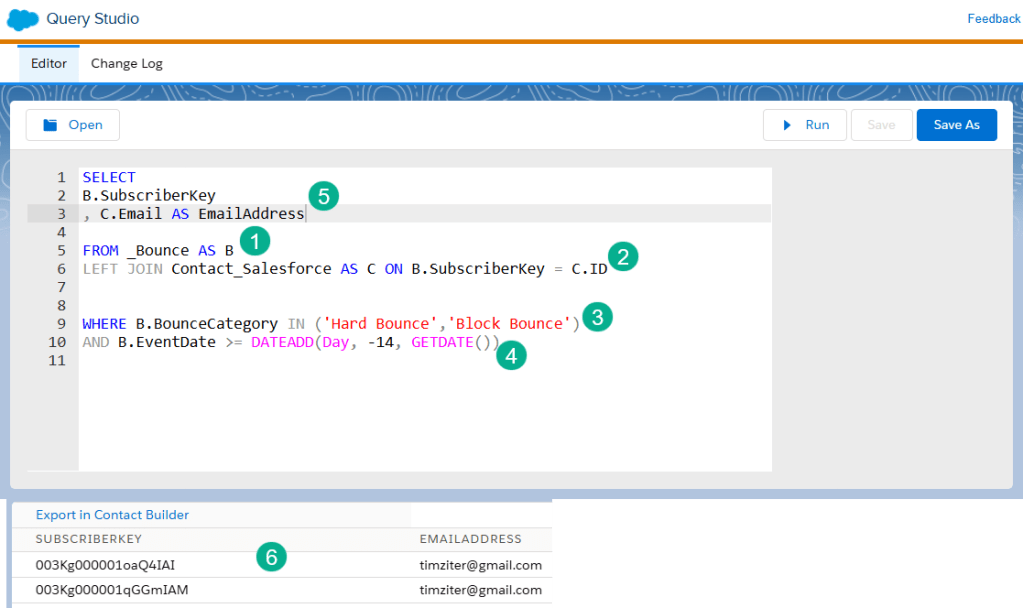 (2) JOIN relevant data extensions to pull in the email address. For this use case we’re using the contact synchronized data extension. You might create another query for Leads as well.