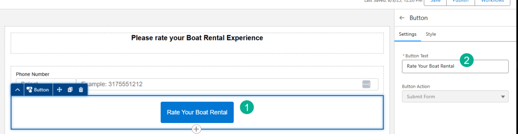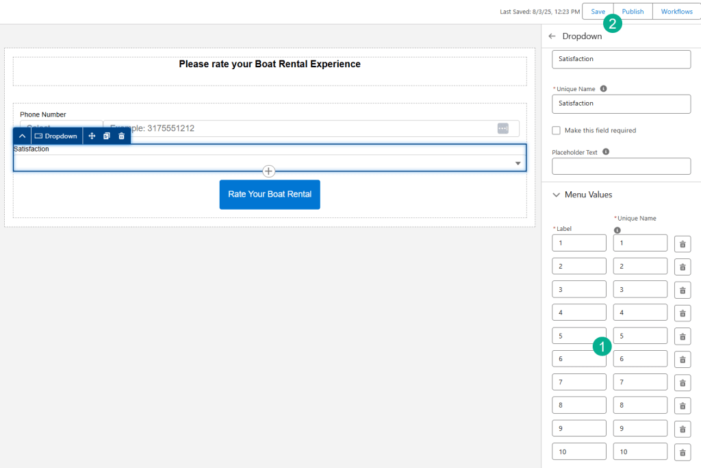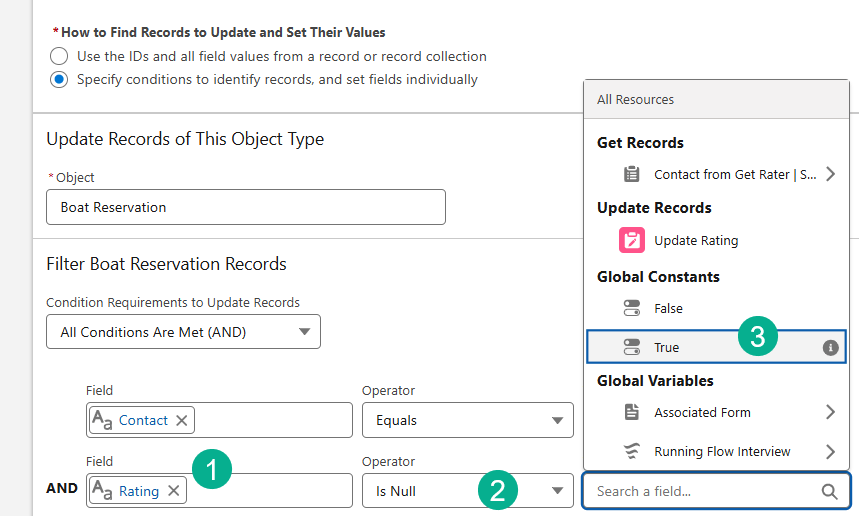 (1) Select the Rating field on the Boat Reservation object.