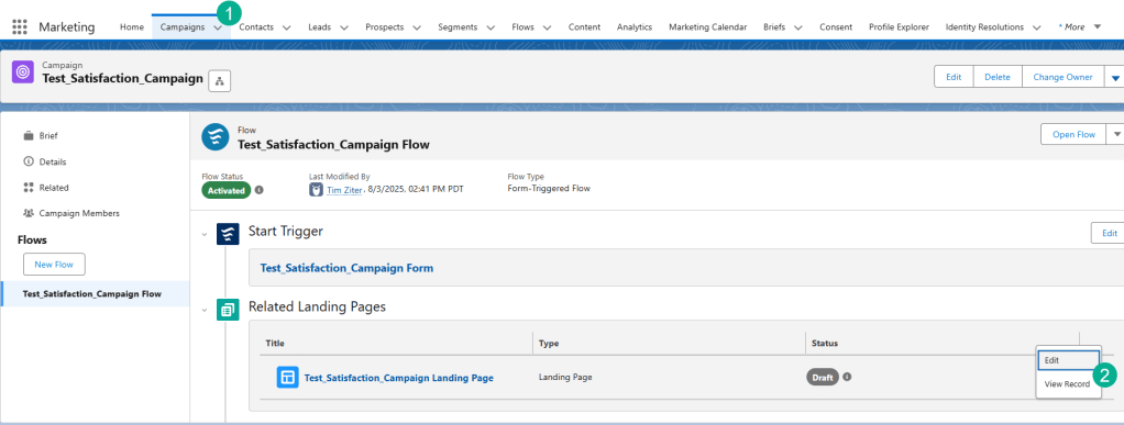 (2) Click the box on the right of the Landing Page and select View Record.