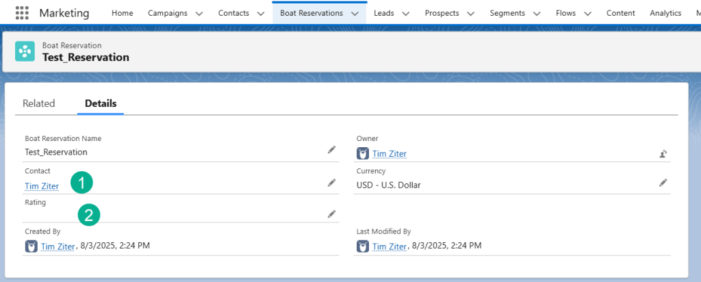 Now let’s test the cloud page to see if it updates the Boat Reservation record. But first let’s take a look at the Boat Reservation object to see the before.