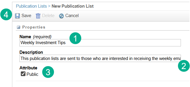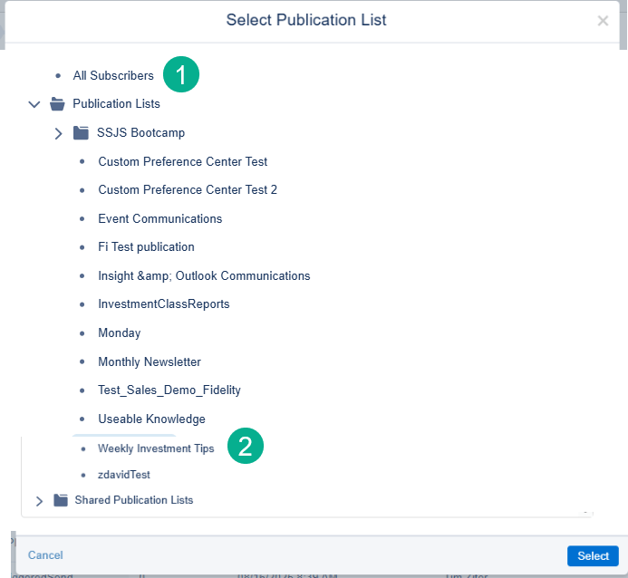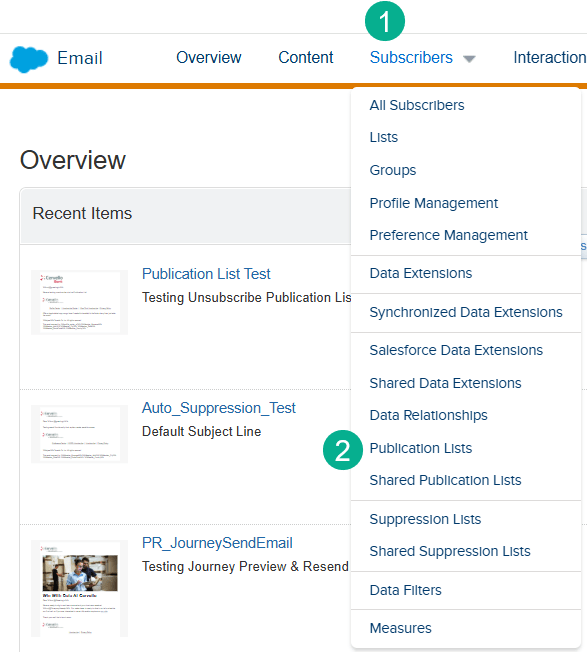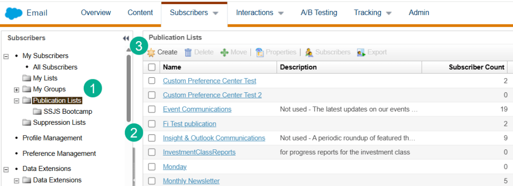 (1) Under the Subscriber tab on the left you will see Publication Lists. Just like most of the file structure in Marketing Cloud you can create sub folders of Publication Lists.