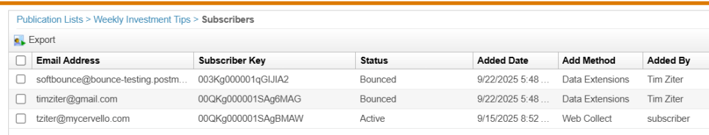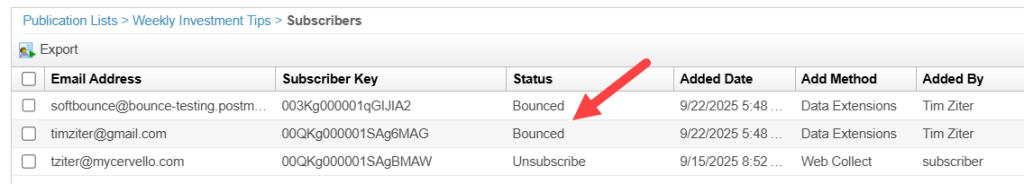 One final point on how Publication Lists work with All Subscribers has to do with Bounce and Held statuses. Although All Subscribers doesn’t change when someone unsubscribes from a Publication List, if someone bounces it’s reflected in All Subscibers.
