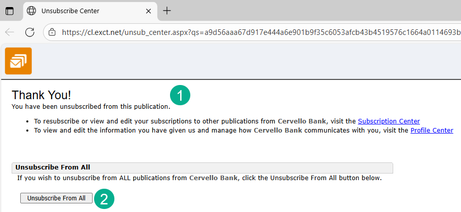 (2) If I want to unsubscribe from all communications I can click here but let’s not do that and see what changes in Marketing Cloud.