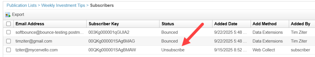 Now I can see that I’ve Unsubscribed from the Weekly Investment Tips publication list. But let’s check All Subscribers to see if I’m unsubscribed there…