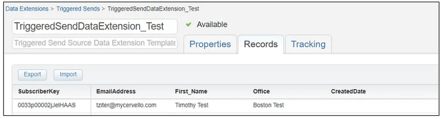 In Marketing Cloud you should see the subscriber above be sent a Triggered Send and their data populated in the Triggered Send data extension.