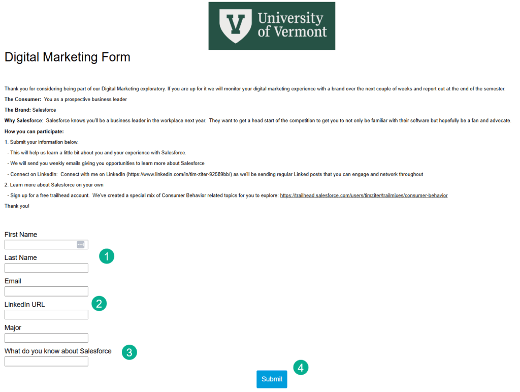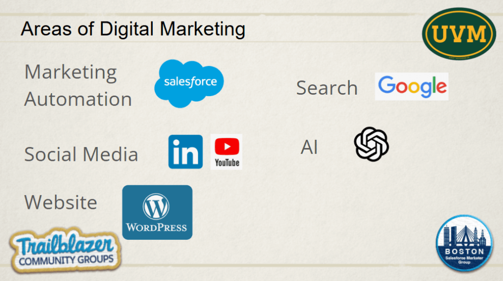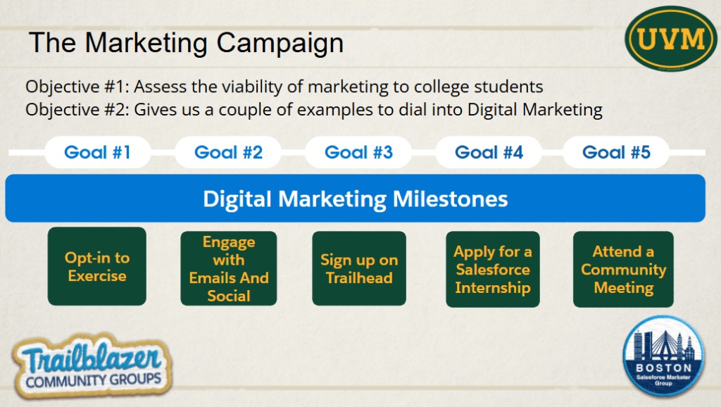 Goal #5: This will be accomplished naturally because the presentation on November 20th at the Business School will also be a Salesforce Boston Marketer Community Group meeting: https://trailblazercommunitygroups.com/events/details/salesforce-salesforce-marketer-group-boston-united-states-presents-digital-marketing-exercise-at-the-university-of-vermont-grossman-school-of-business/