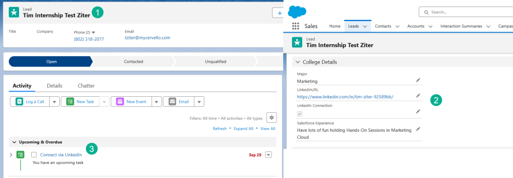 (3) We’re able to capture our interactions with each student in Salesforce, for example this activity tracks connecting via LinkedIn.
