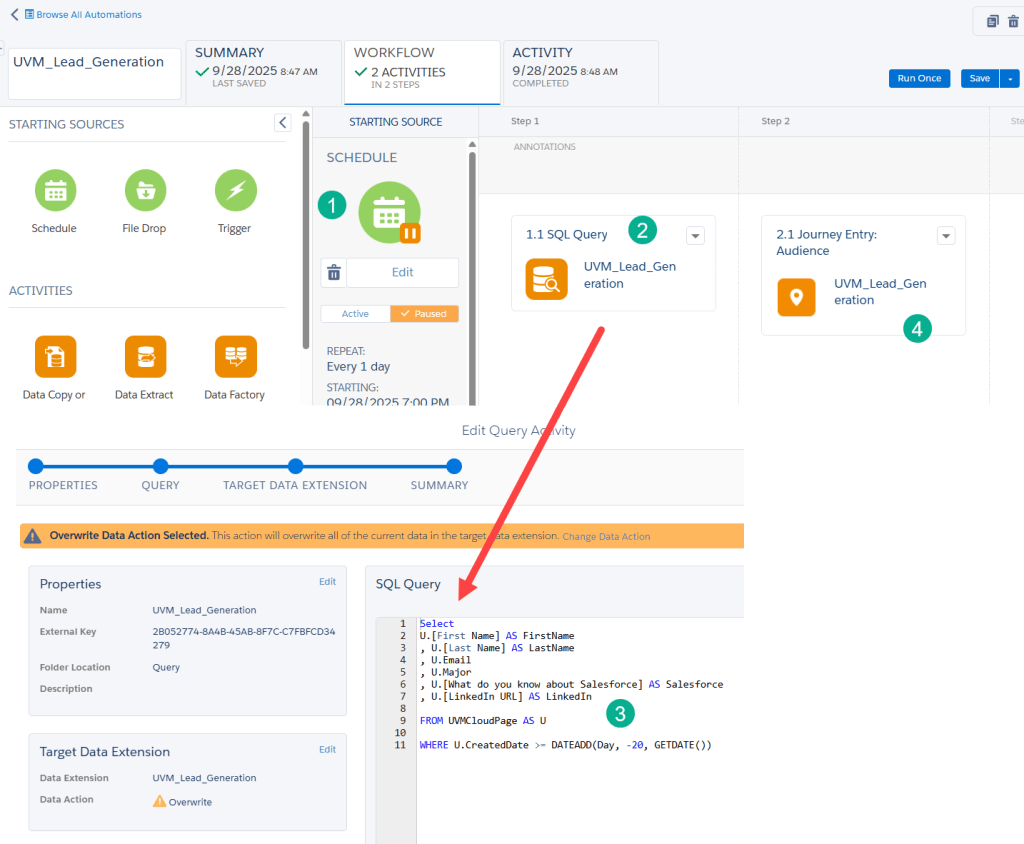 First thing we need to build is an Query based automation to send these newly created subscribers into a Journey that will create lead records in Salesforce.