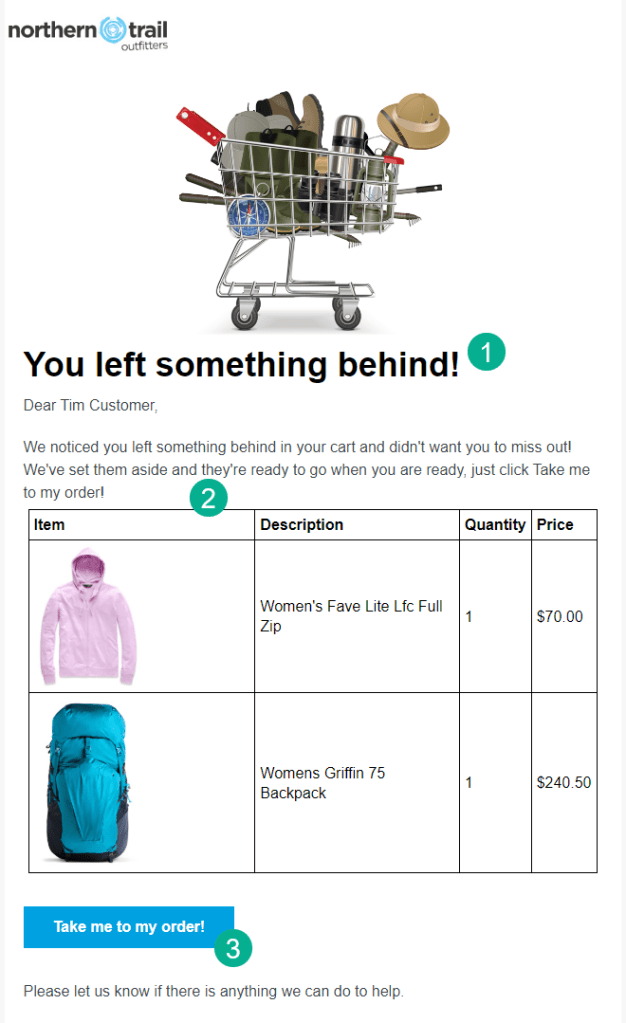 (3) A call to action is included to bring the subscriber back to their cart.