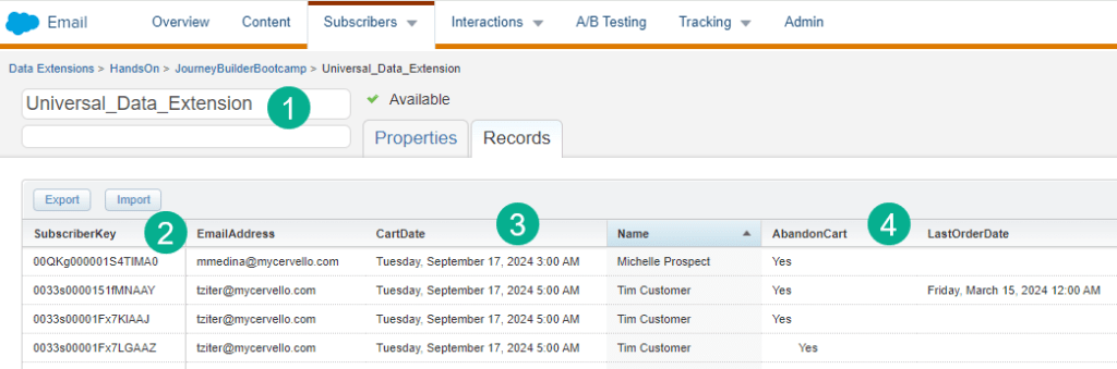 (3) Fields specifically for the Abandon Cart use case can be added like in this example the last cart date. This date could trigger an abandon cart email send.