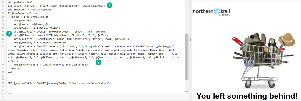 (1) First a lookuprows as there can be multiple rows of abandoned products. For more on the LookupRows functionality check out our blog page: https://handsonsfmc.com/part-3-lookuprows-function/ This is why you need to set the @SubscriberKey variable as this is the key identifier in the Cart_Feed data extension.
