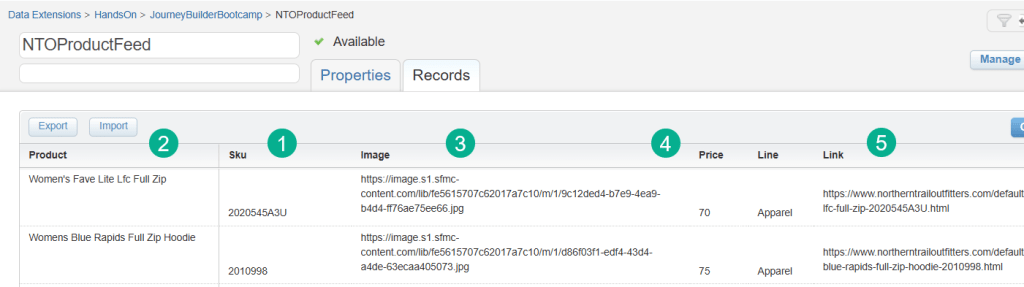 C.) Converting Cart Data to Products – With the product sku information you can set up a data extension for each sku that contains in our use case the image and description of each cart sku item.