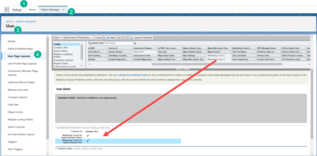 (5) Drag from the menu of fields Marketing Cloud for AppExchange User and Marketing Cloud for AppExchange Admin and click save.
