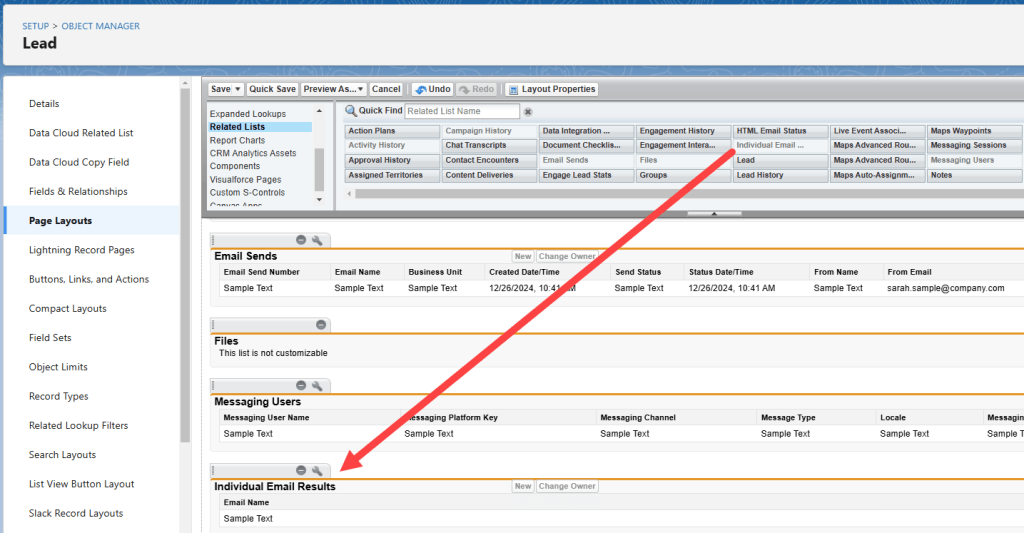 Next drag the Individual Email Results related list down to the bottom of the page layout.