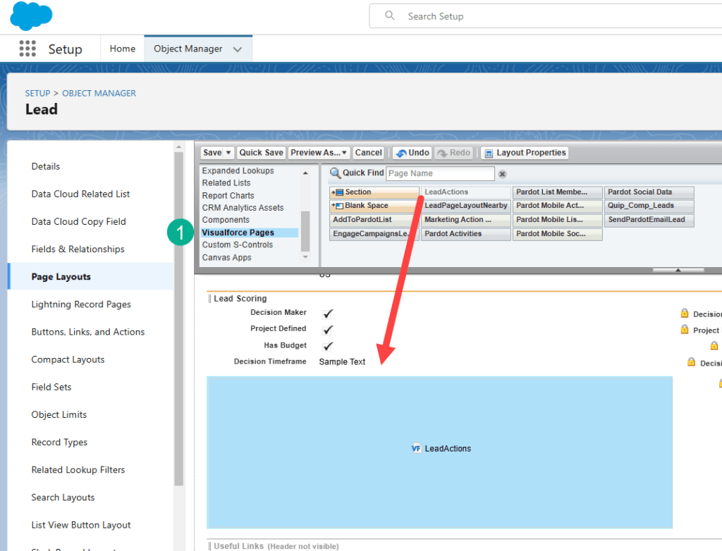 Next you want to drag the LeadActions visualforce page to the page layout.