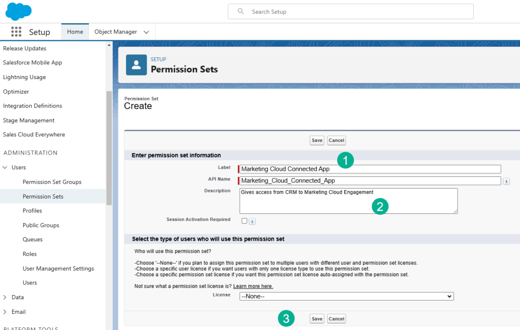 (2) Add in a description: Gives access from CRM to Marketing Cloud Engagement.