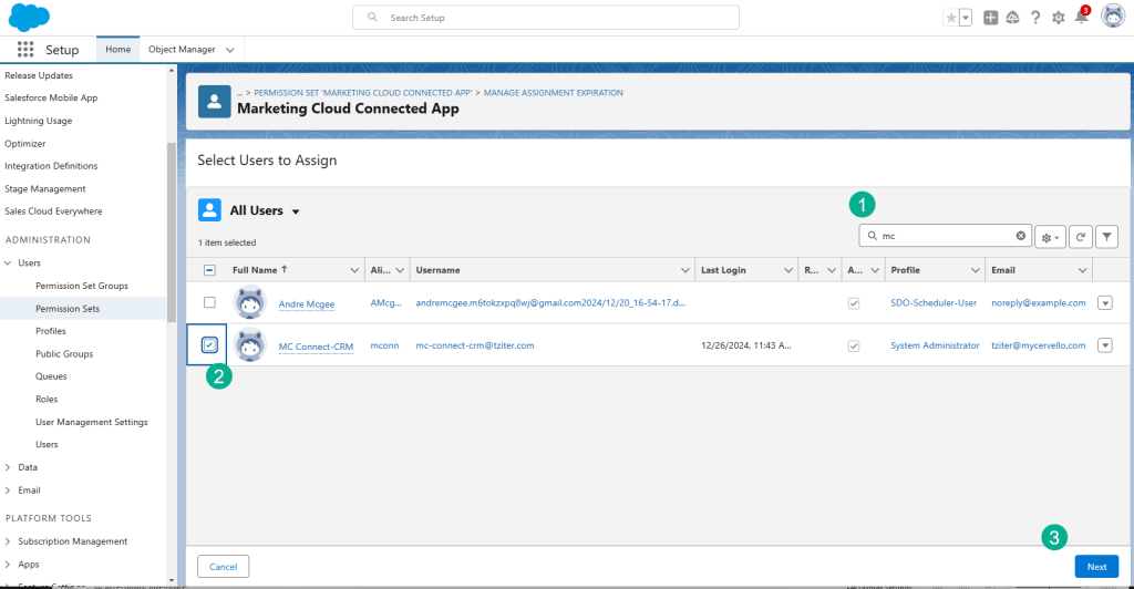 Navigate to the user that will be the Marketing Cloud admin which might be you.