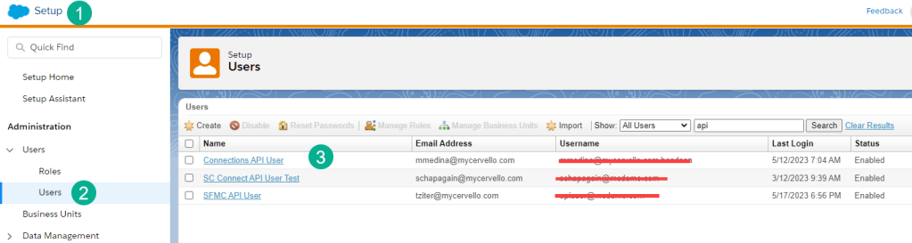 You’ll want to set up a unique user in both the SF CRM and SFMC environment. In Session I we set up the SF CRM API user, to view that session click here: https://handsonsfmc.com/2023/05/14/implementation-series-marketing-cloud-connect-part-i/ Now we want to create an API user in the SFMC platform.