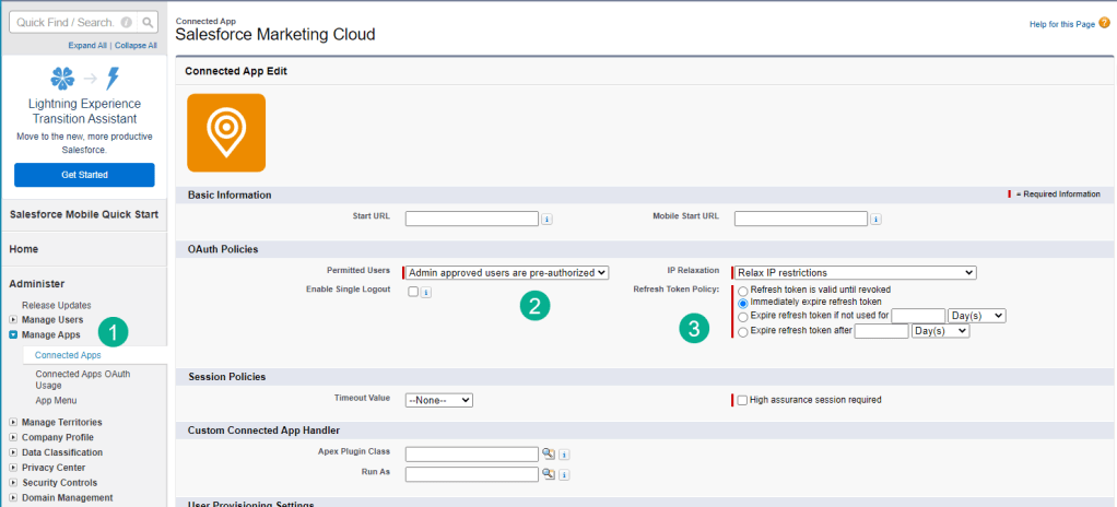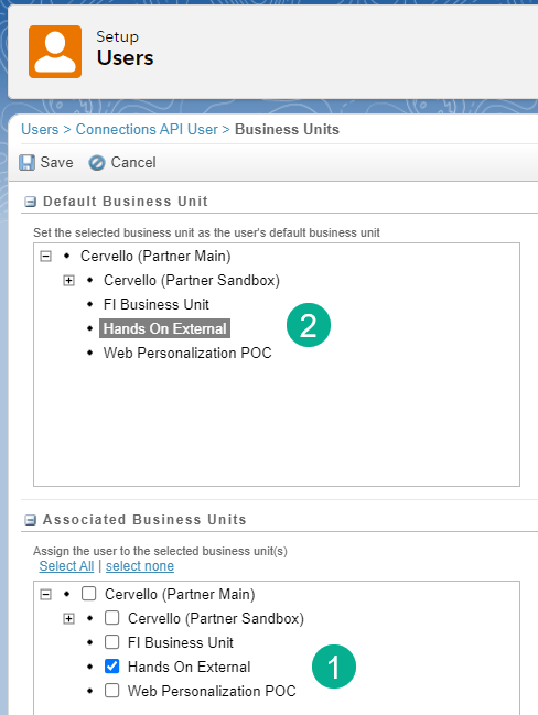 In setup under Apps > Salesforce Integration logged in as (1) the API user you will connect via clicking on the Blue button and selecting the appropriate Scope By User (2) depending on your access needs. A window will pop up asking the user to log into the Salesforce CRM environment as the API user. Once connected please verify that the Marketing Cloud instance is connected to the correct Salesforce org (3).