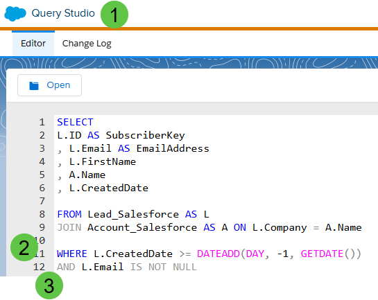 (2) In the WHERE you’ll want to list the different filters. In this example I’ve got my variable L.CreatedDate which is a value on the Lead synchronized data extension. And we want to pull only those leads with a created date greater than the last 24 hours.