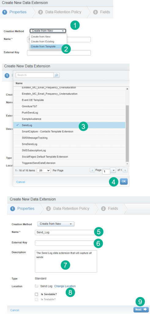 Step II: Create a new data extension in the Send Log folder and fill in the Properties tab