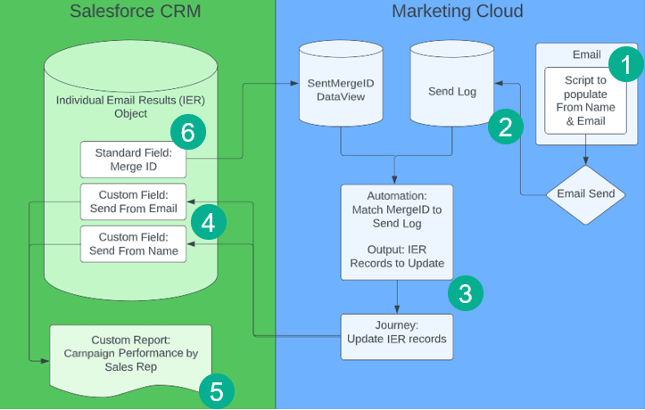 (1) The SentMerge data view is a custom data view that you can add on to your environment if you reach out to your Marketing Cloud account executive. It will have that all important MergeID to link to the IER record in Salesforce CRM.
